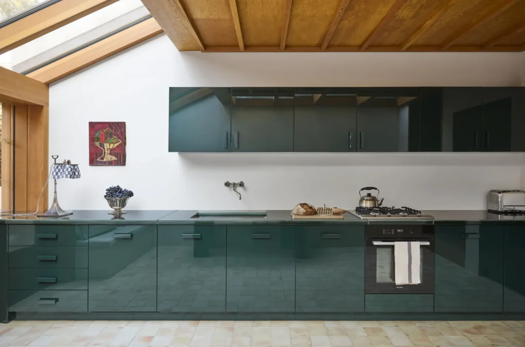 • Joinery: Bespoke cabinetry used smoked oak veneers and brass inlays, referencing both Victorian craftsmanship and mid-century design profiles.